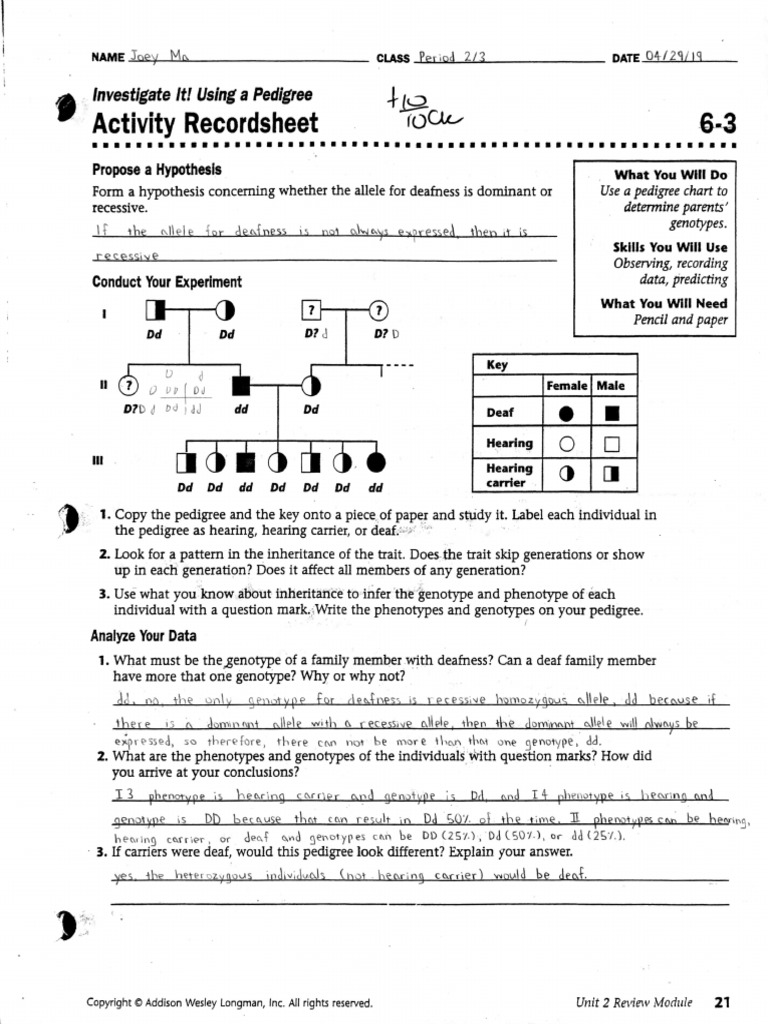 Pedigree analysis exercise answer sheet. Is this trait dominant or recessive? 79 lab 41 pedigree analysis exercise sheets for pedigree analysis lab name: Type pedigree mystery mystery in isd 2135 maple river schools . A person can be a carrier of a trait, .